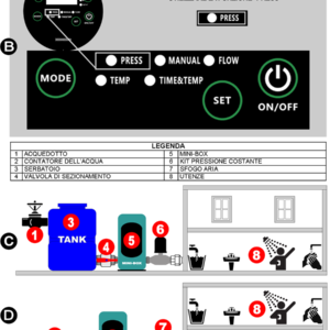 è dotata di inverter, dove la velocità minima assorbe 90W e la velocità massima assorbe solo 250W di potenza, il flussostato consente di lavorare in automatico con start-stop all’apertura-chiusura del rubinetto di erogazione dell’acqua, il kit trasduttore-temperatura consente: il funzionamento a pressione costante in modulazione di potenza, circolazione in funzione della temperatura impostata, funzionamento temperatura/tempo, manuale a velocità costante, oppure in posizione di riposo (stop); La bassa potenza impiegata per l’esercizio consente di ottenere un risparmio energetico dal 40% al 60% rispetto a un autoclave tradizionale;